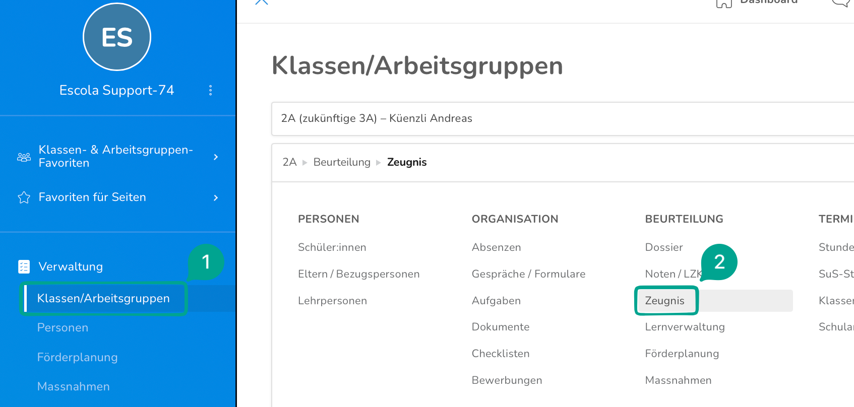 Um die Absenzen in die Zeugnisse zu übernehmen, gehe unter Verwaltung > Klassen/Arbeitsgruppen auf Zeugnis.