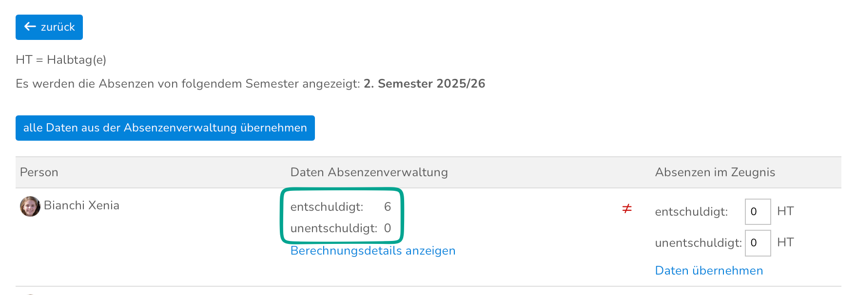 Absenzen ins Zeugnis übernehmen