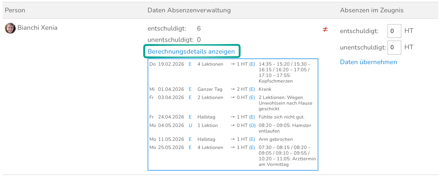 Wenn du nun auf "Berechnungsdetails anzeigen" klickst, werden dir die einzelne Absenzen angezeigt. In der Absenzenverwaltung können entweder ganze oder halbe Tage erfasst werden oder eine bestimmte Anzahl an Lektionen.