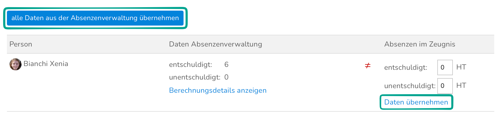 Um die Absenzen nun für alle SuS dieser Klasse ins Zeugnis zu übertragen, klicke auf "alle Daten aus der Absenzenverwaltung übernehmen". Alternativ kannst du diese Aktion auf für einzelne Schüler:innen durchführen, indem du auf "Daten übernehmen" klickst.