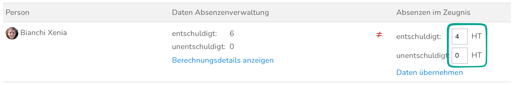 Wenn die Absenzenverwaltung für Schüler:innen-Absenzen bei deiner Schule genutzt wird, können Absenzen automatisiert ins Zeugnis übernommen werden.