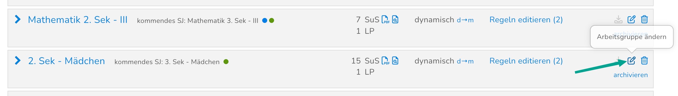 1. Wähle unter Verwaltung > Klassen/Arbeitsgruppen > Arbeitsgruppen im aktuellen Schuljahr bei jeder fortbestehenden Arbeitsgruppe das Stiftsymbol, um die Arbeitsgruppe zu ändern:
