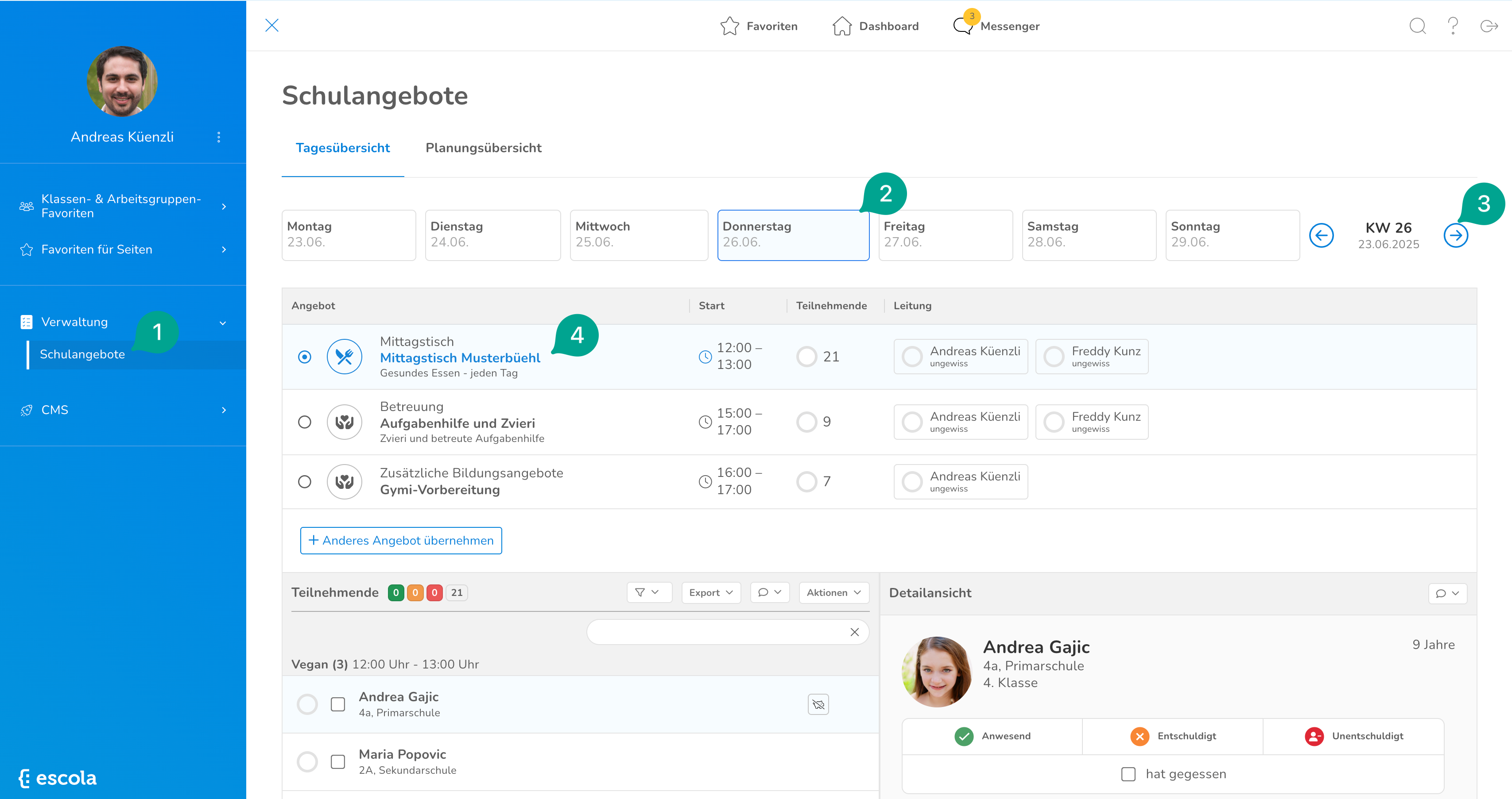Anschliessend.befindest du dich in der Tagesübersicht, wo der heutige Tag angewählt ist (2). Durch das anklicken von anderen Tagen oder den Pfeilen kann zwischen den Tagen oder Wochen hin und her gewechselt werden (3). Unten siehst du in der Tagesübersicht für welche Angebote du am ausgewählten Tag zuständig bist (4).
