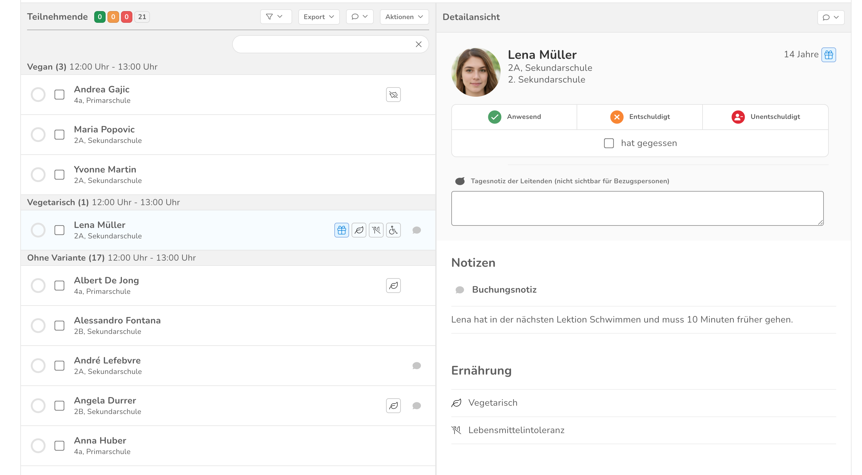 Im unteren Teil siehst du auf der linken Seite die Liste aller Schüler:innen, welche an diesem Tag eine Buchung für das ausgewählte Angebot haben. Wenn du auf eine Schülerin oder ein Schüler klickst, dann siehst du anschliessend rechts die Detailansicht mit den relevanten Informationen zum Kind.