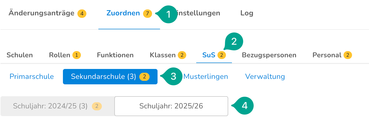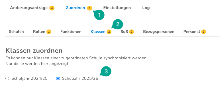 Die Zuordnungen der SuS ist nach Klassen gegliedert. Wenn du bestimmte SuS zuordnen willst, musst du zuerst die entsprechende Klasse aufklappen (1).