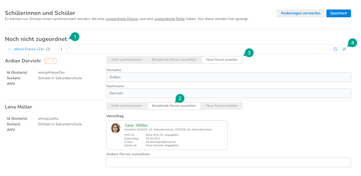 - Falls die Person in Escola bereits existiert, klickst du auf "Bestehende Person auswählen" (2) und übernimmst die Person im Vorschlag oder wählst eine andere Person aus, sollte der Vorschlag nicht übereinstimmen