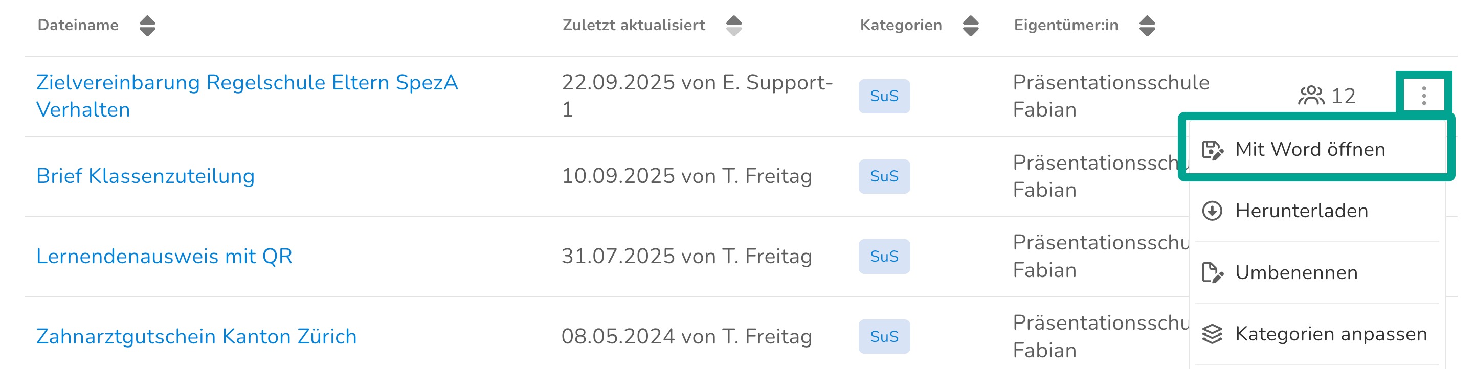 - Anschliessend siehst du deine hochgeladene Vorlage im Reiter «Verwalten» (11). Du kannst via Context-Menü (12) diverse Aktionen ausführen wie beispielsweise umbenennen, ersetzen oder deinen Kollegen freigeben.