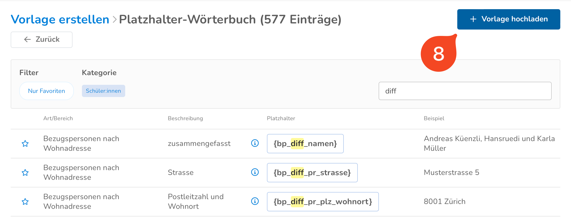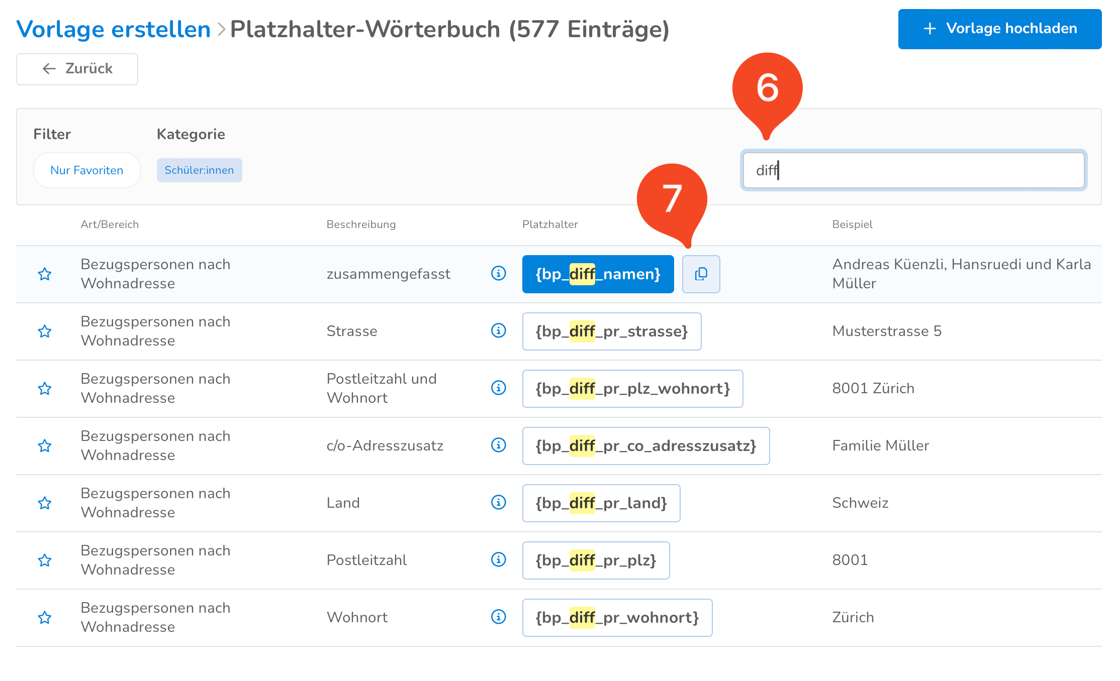 - Nutze die Suchfunktion (6), um schnell nach den gesuchten Platzhaltern zu filtern. In diesem Fall suchen wir nach Platzhaltern, welche die Bezeichnung «diff» enthalten. Mit einem Klick auf das Kopier-Icon (7) kannst du diese schnell in die Zwischenablage kopieren, um sie danach in dein Word-Dokument einzufügen.
