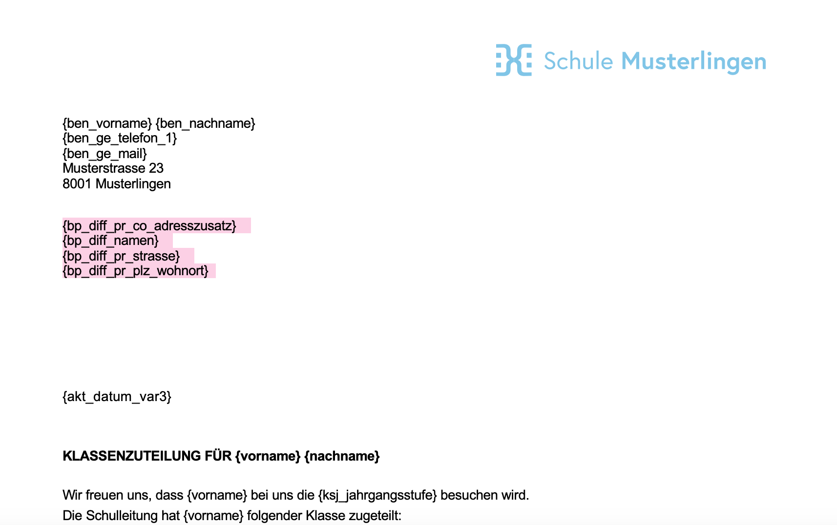 Das könnte beispielsweise folgendermassen aussehen (siehe Bild unten). Du findest bei den Dokumentvorlagen unter «Beispiele», diese Vorlagen-Beispiele («Brief Klassenzuteilung», «Zahnarztgutschein» & «Elternbrief») auch zum Download.
