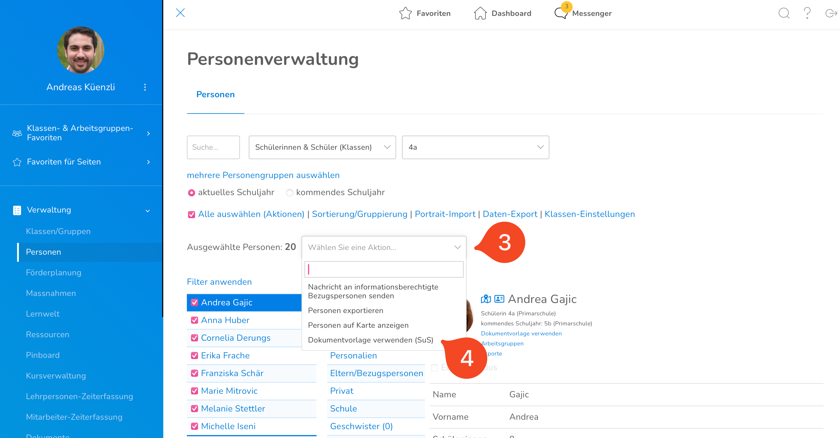 - Sobald du Personen auswählst, erscheint dir ein Aktionsfeld (3). Wähle die Option «Dokumentvorlage verwenden (SuS)» (4).