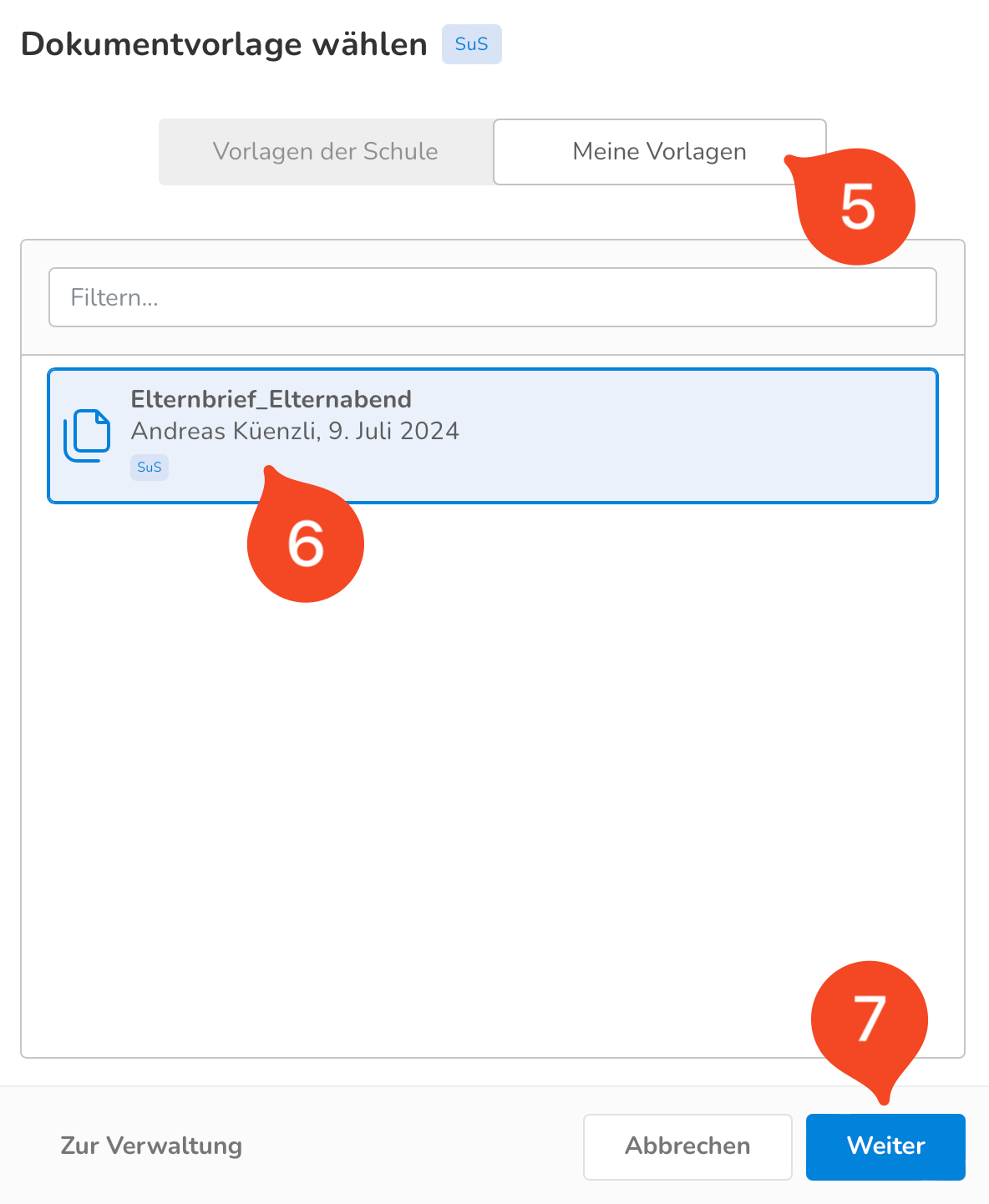 - Gehe zu «Meine Vorlagen» (5), wähle das entsprechende Dokument aus (6) und klicke auf «Weiter» (7).