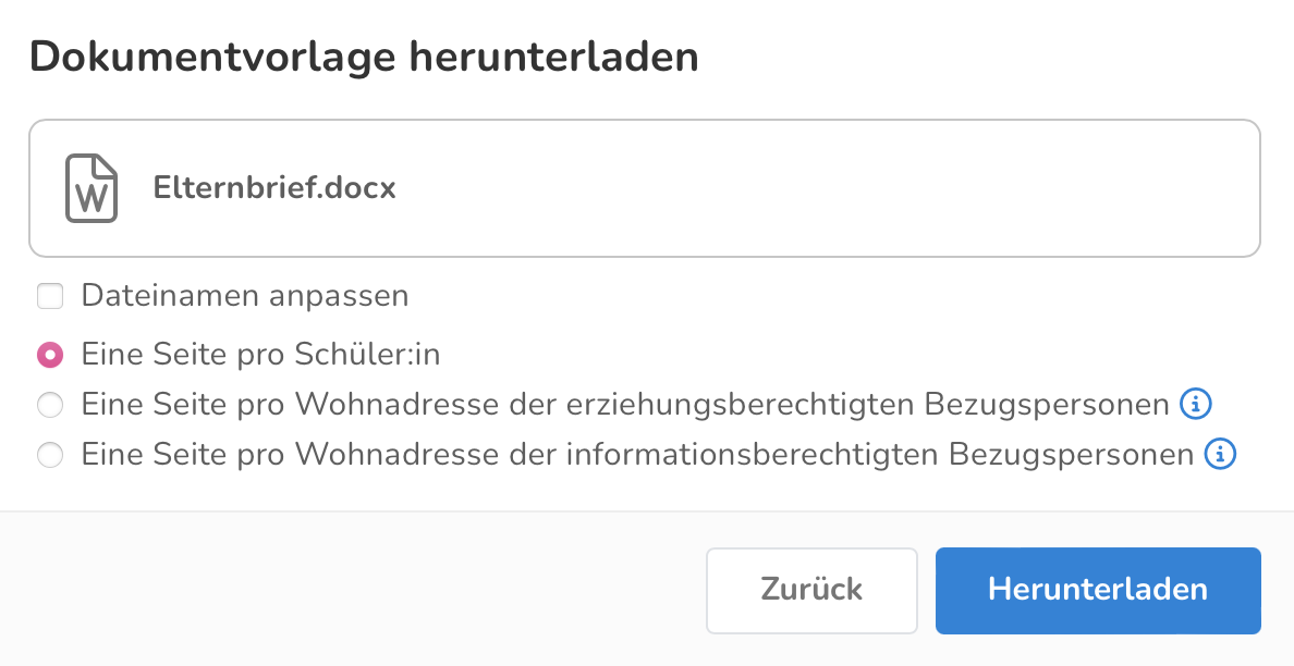 Bei dieser Option wird pro Kind lediglich ein Elternbrief erstellt, auch wenn die Bezugspersonen nicht am gleichen Ort wohnen.