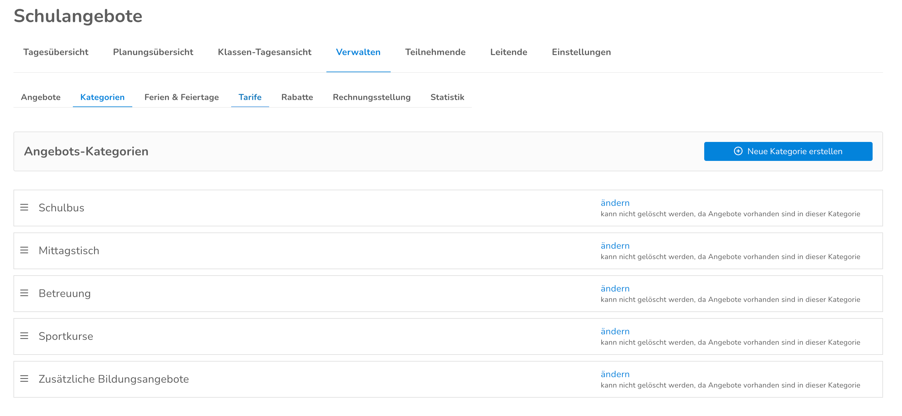 • Kategorien dienen der Organisation der Schulangebote (z. B. „Transport“, „Mittagessen“, „Freizeitangebote“).