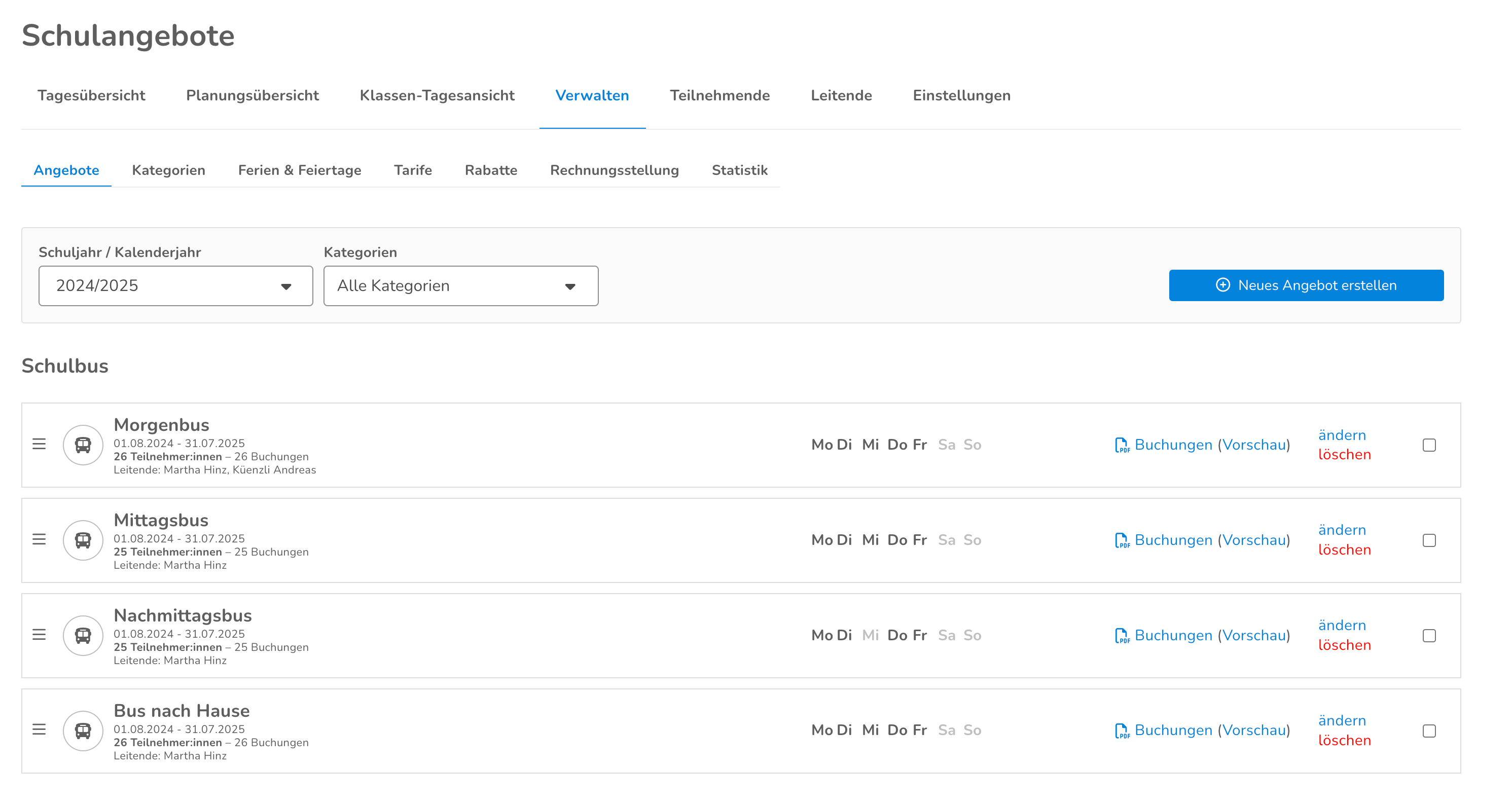 • Bestehende Schulangebote duplizieren und das Start- und Enddatum automatisch um ein Jahr verschieben.