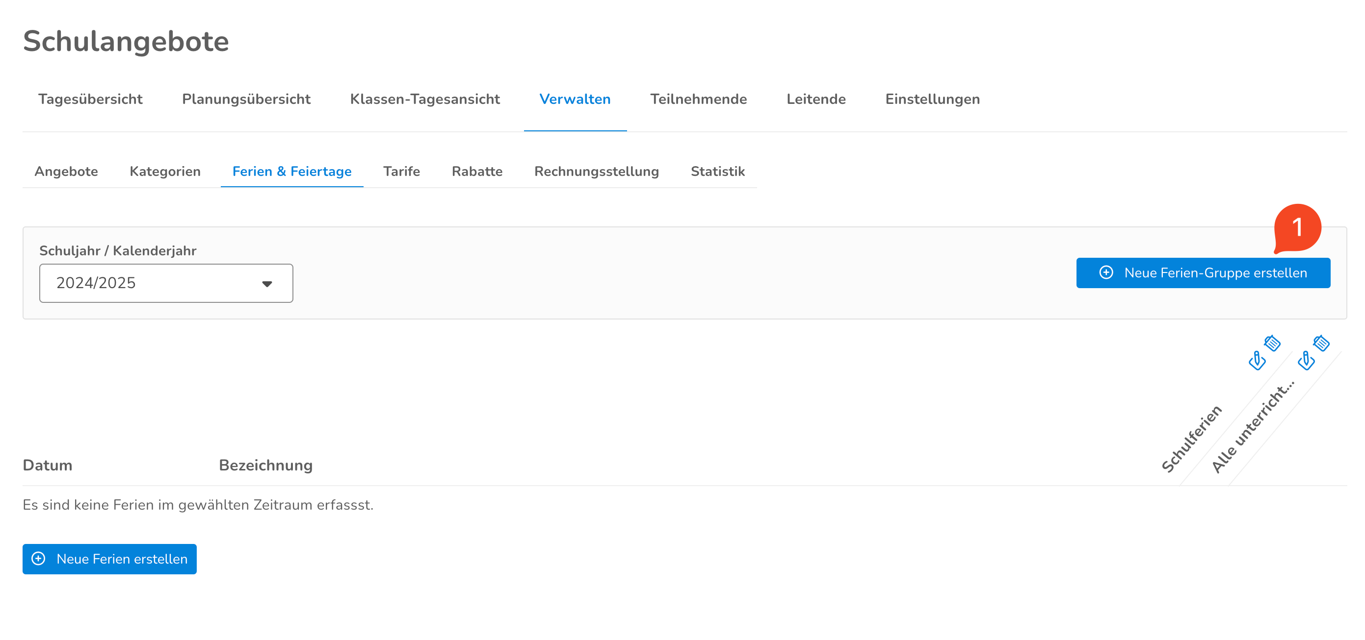 Durch die richtige Konfiguration der Ferien & Feiertage wird sichergestellt, dass alle Schulangebote zur richtigen Zeit stattfinden und korrekt abgerechnet werden.