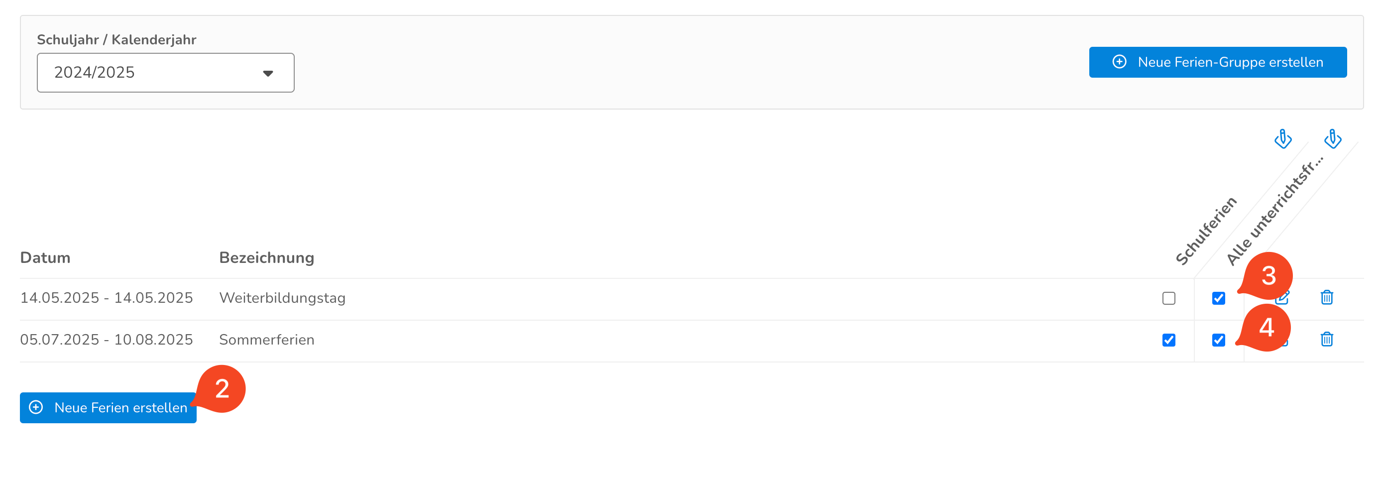Unter Verwalten > Ferien & Feiertage können mehrere Feriengruppen (1) erstellt werden. Danach werden die Ferien, Feiertage und unterrichtsfreien Tage erfasst und einer oder mehreren Feriengruppen zugeordnet.