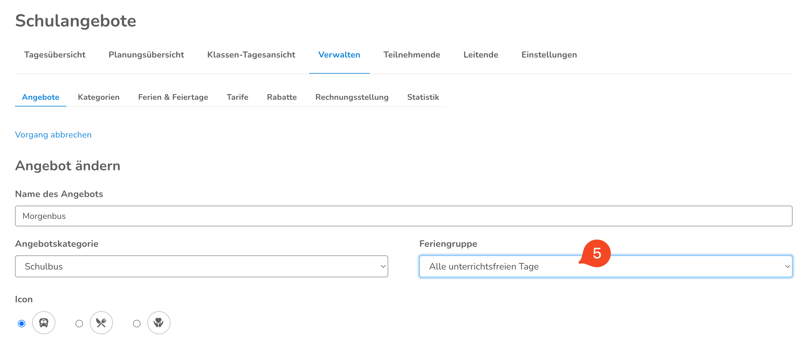 Nachdem die Ferien und unterrichtsfreien Tage erfasst wurden, muss pro Angebot festgelegt werden, welche Feriengruppe dafür gilt (5).