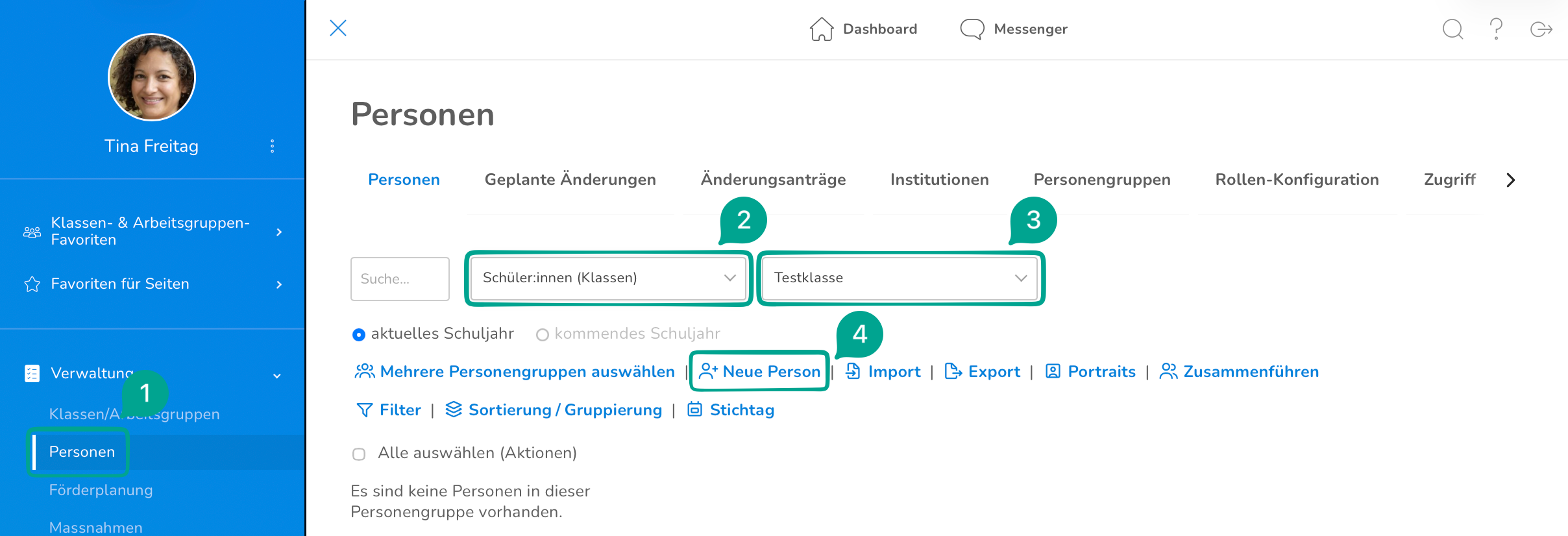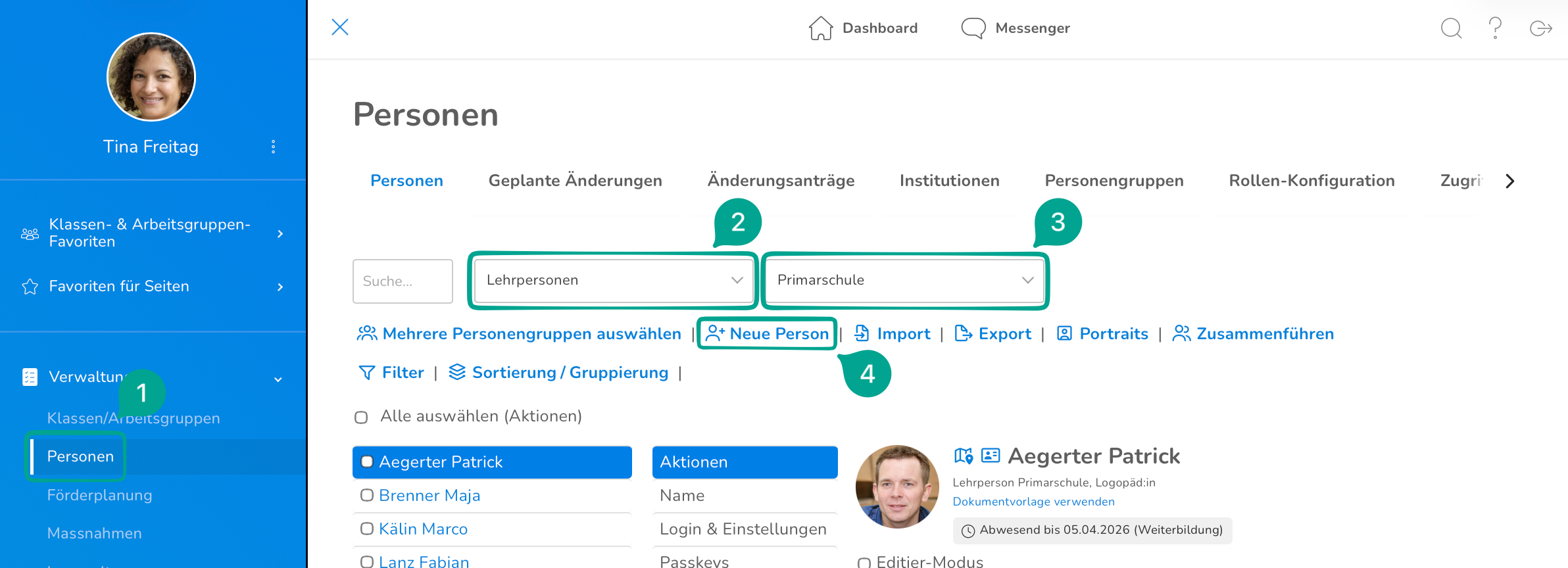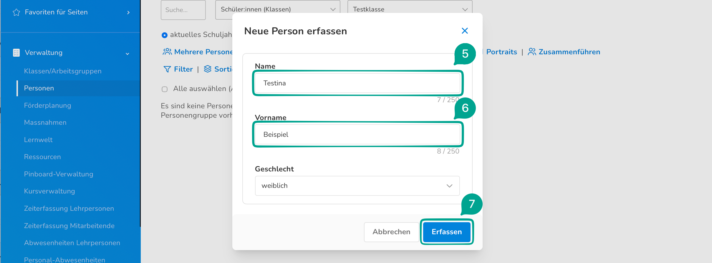- Erstelle eine neue Lehrperson, ebenfalls mit einem erkennbaren Namen (z. B. Testlehrerin Beispiel) (1-4)