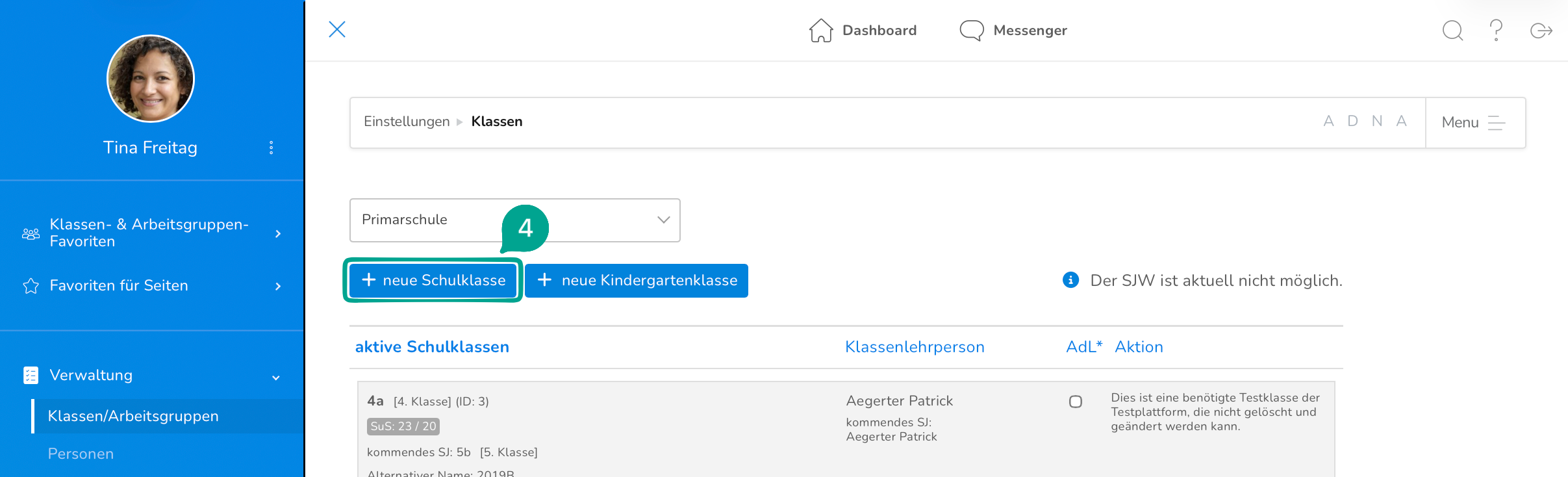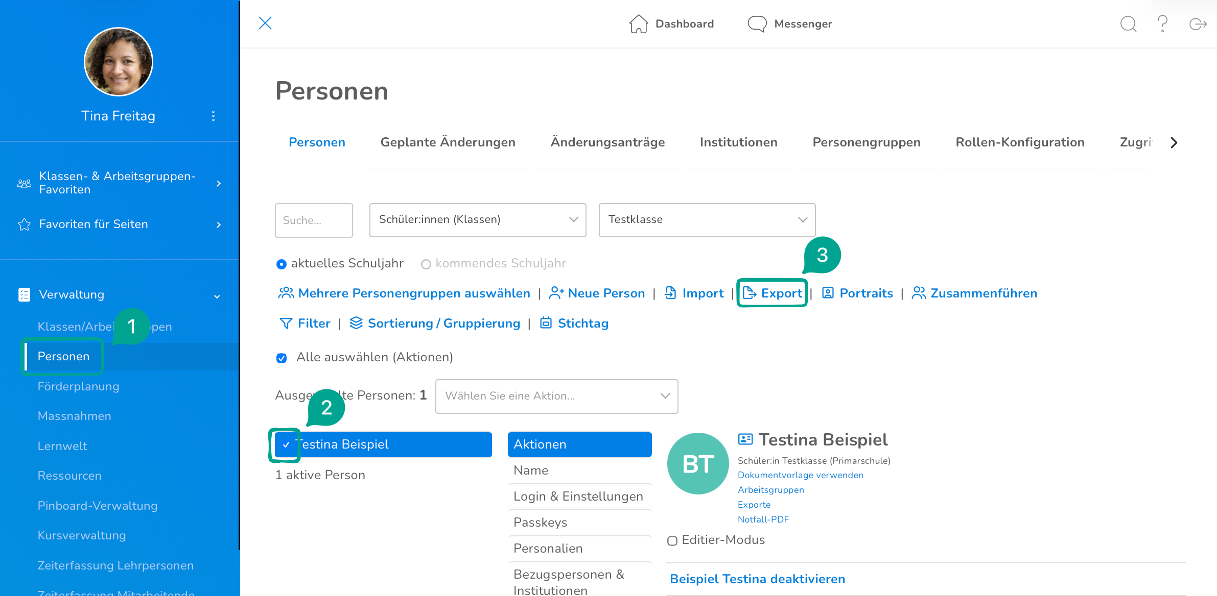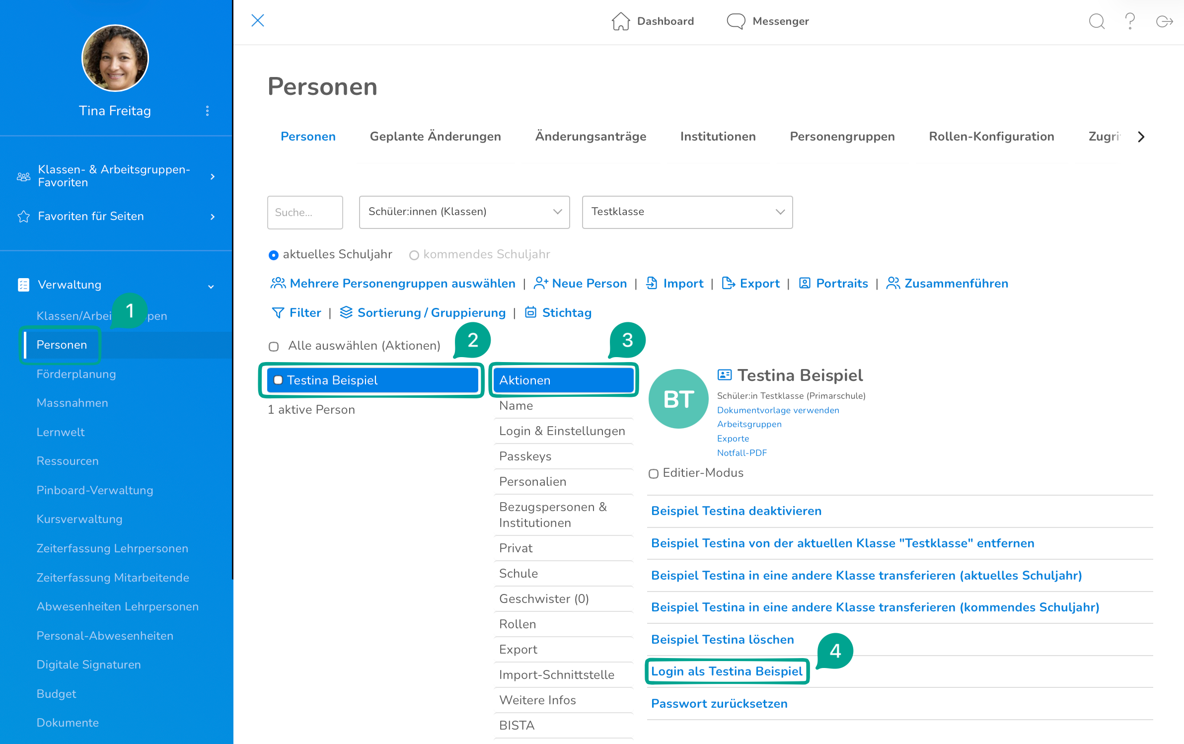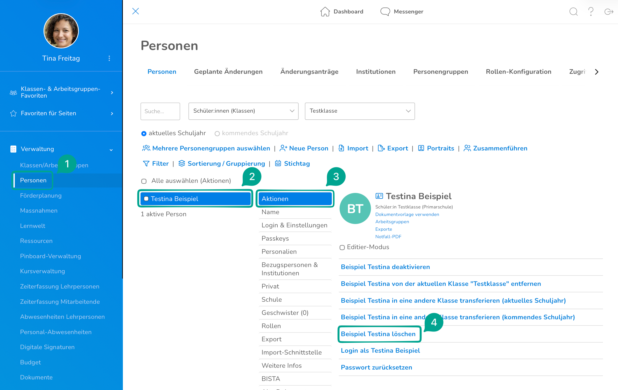 - Erstelle eine neue Lehrperson, ebenfalls mit einem erkennbaren Namen (z. B. Testlehrerin Beispiel) (1-4)