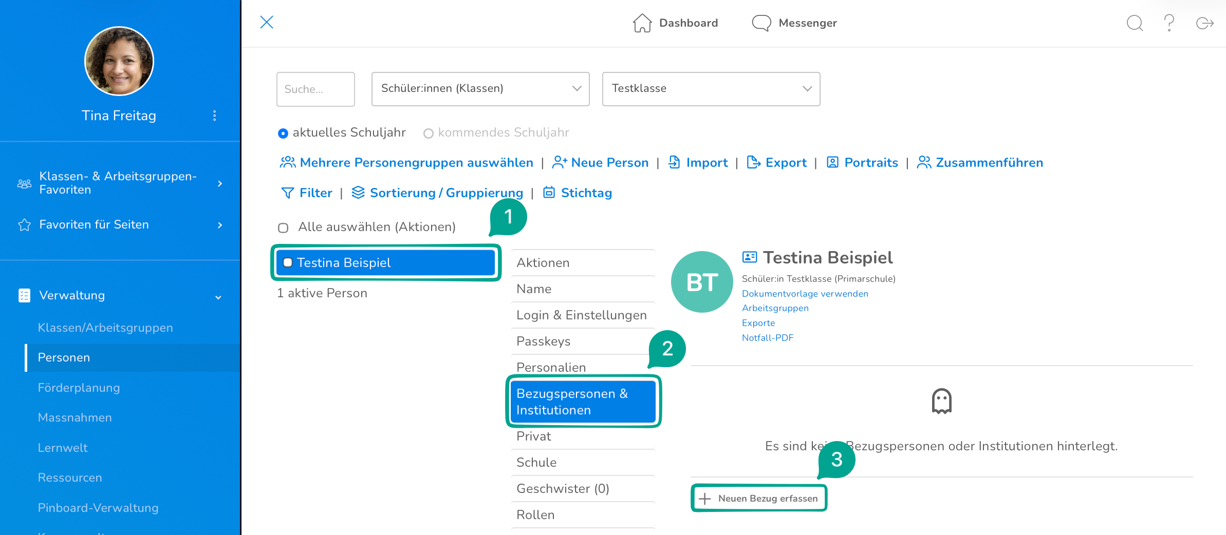 - Gehe zur oben erstellten neuen Schülerin und öffne den Reiter "Bezugspersonen & Institutionen" (1-2)