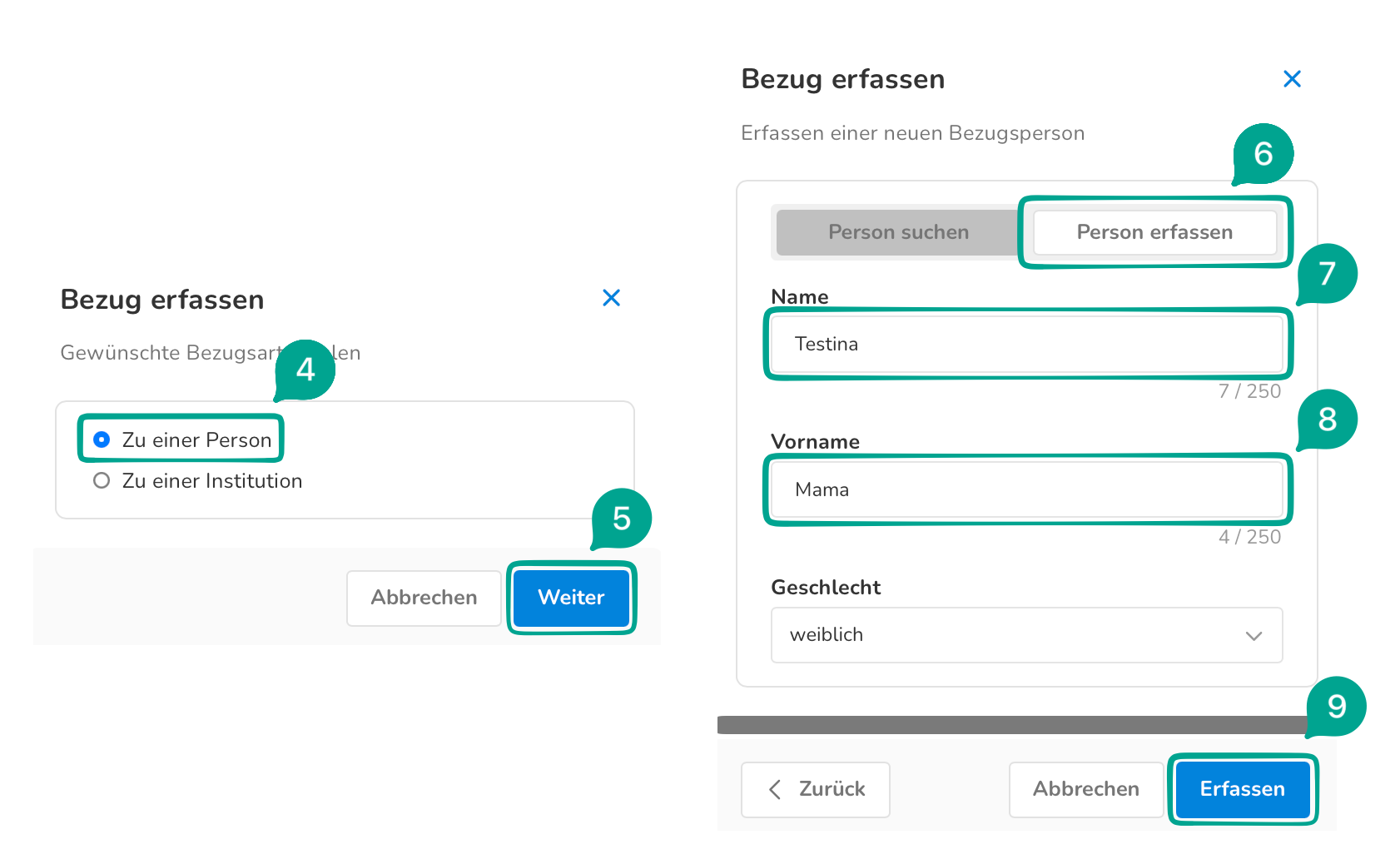 - Erstelle eine neue Bezugsperson indem du "Person erfassen" wählst und einen Namen sowie das Geschlecht setzt und anschliessend mit "Erfassen" speicherst (6-9)