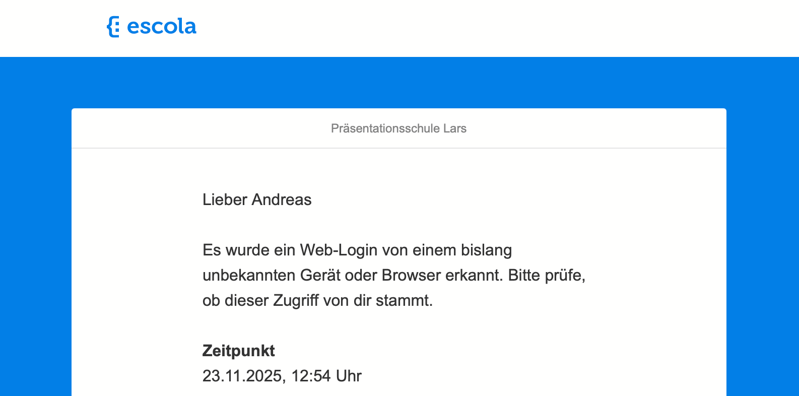 In all diesen Fällen kann Escola nicht erkennen, ob Sie auf demselben Gerät wie sonst arbeiten – und schickt Ihnen deshalb automatisch eine E-Mail und Push-Nachricht.