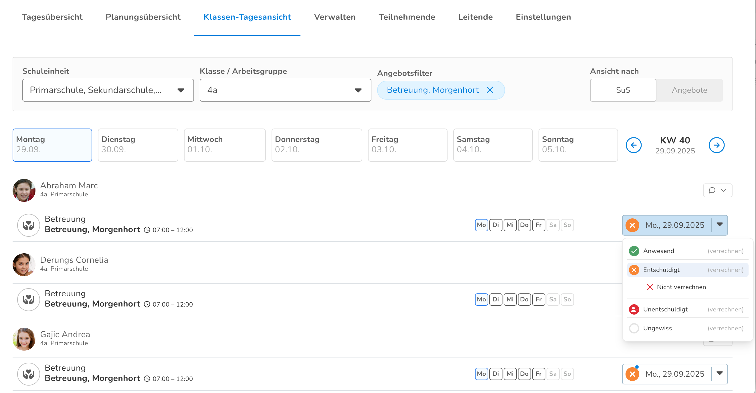Wenn eine ganze Klasse abwesend ist (z.B. wegen eines Ausflugs), ist die Klassen-Tagesansicht optimal für die Übersteuerung: