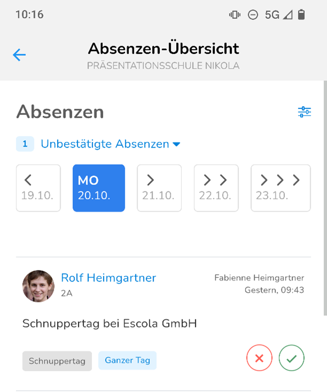 In der Übersicht, siehst du die Absenzen des aktuellen Tages. Über die Pfeile, kannst du dir aber auch vergangene oder künftige Absenzen anzeigen lassen.