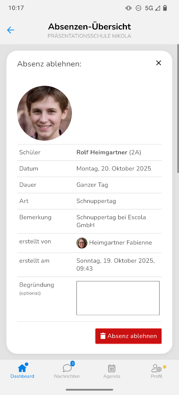 Um eine Absenz abzulehnen, klicke auf das rote Kreuz. Im nächsten Fenster kannst du noch eine Begründung einfügen und auf "Absenz ablehnen" klicken.