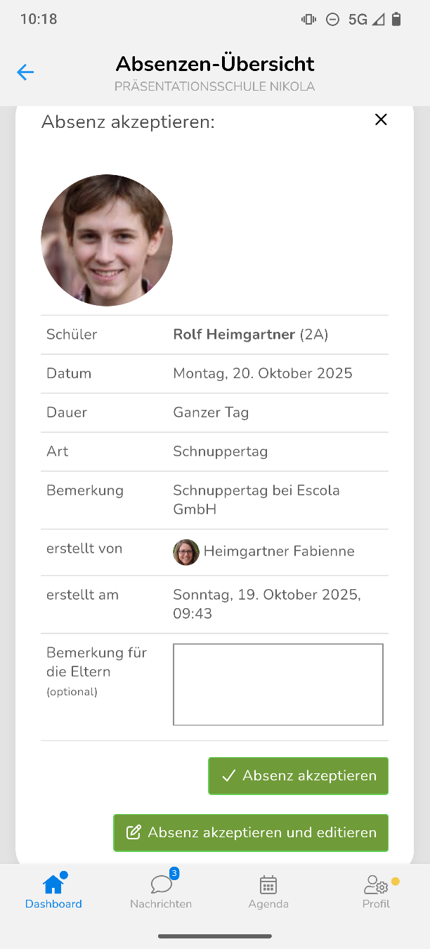 Um eine Absenz anzunehmen, klicke auf das grüne Häkchen. Bei Bedarf kannst du hier noch eine Bemerkung einfügen und dann auf "Absenz akzeptieren" klicken.