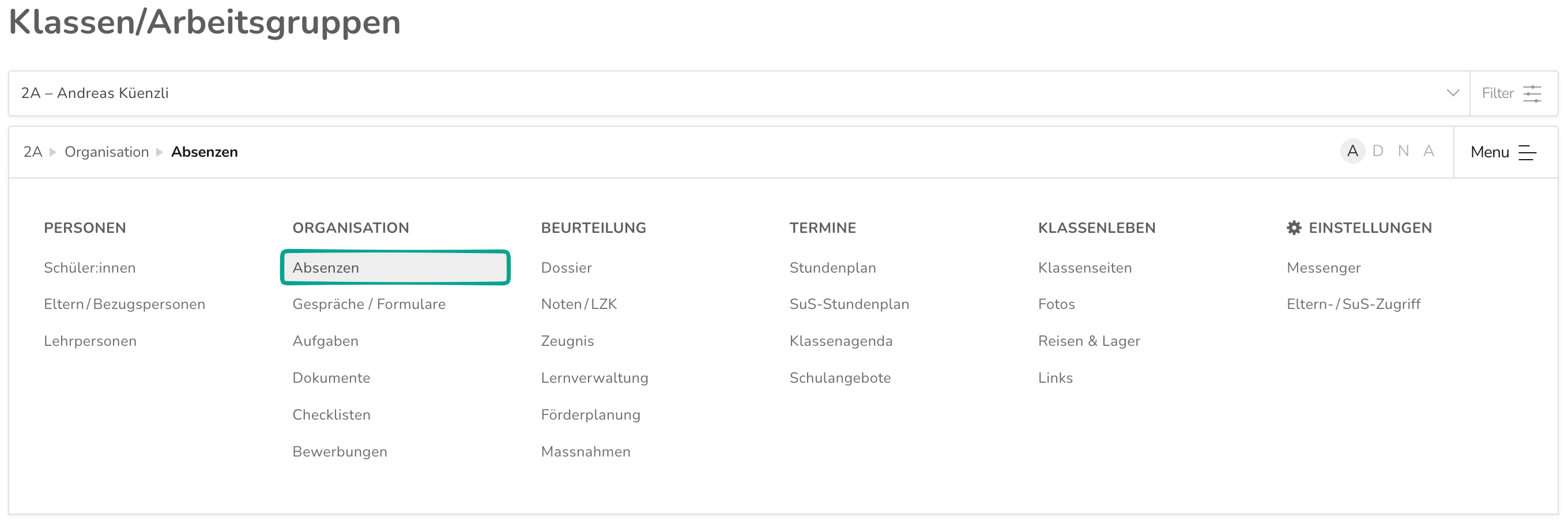 Eine andere Möglichkeit, die Absenzen einzusehen ist unter Verwaltung > Klassen/Arbeitsgruppen. Rufe dort die entsprechende Klasse oder Arbeitsgruppe auf und wähle im zweiten Menü "Absenzen".
