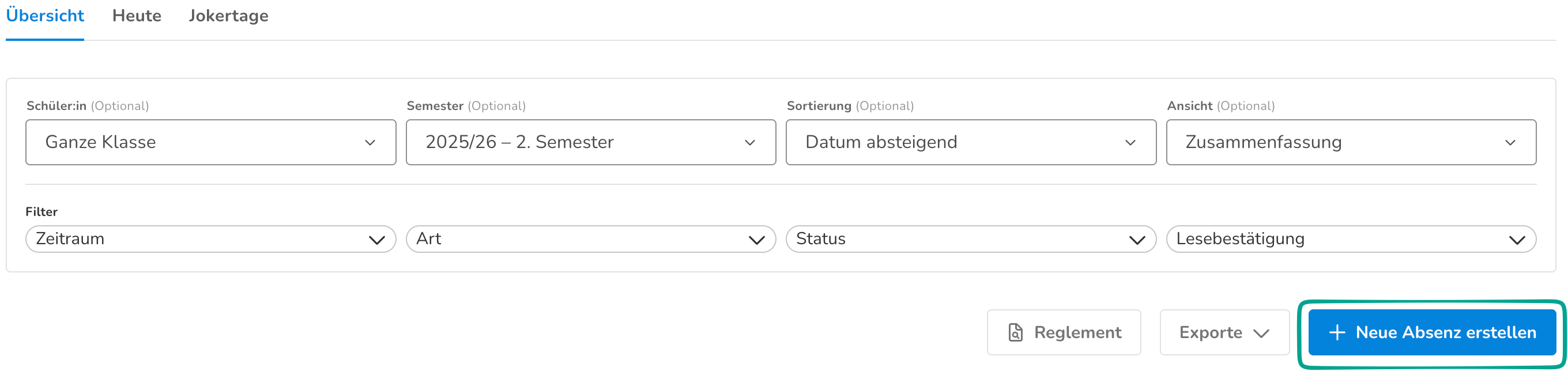 Hier siehst du alle Absenzen der Klasse, kannst dir mit einem Klick aber auch nur die heutigen Absenzen oder eine Übersicht über die Jokertage der Klasse anzeigen lassen.