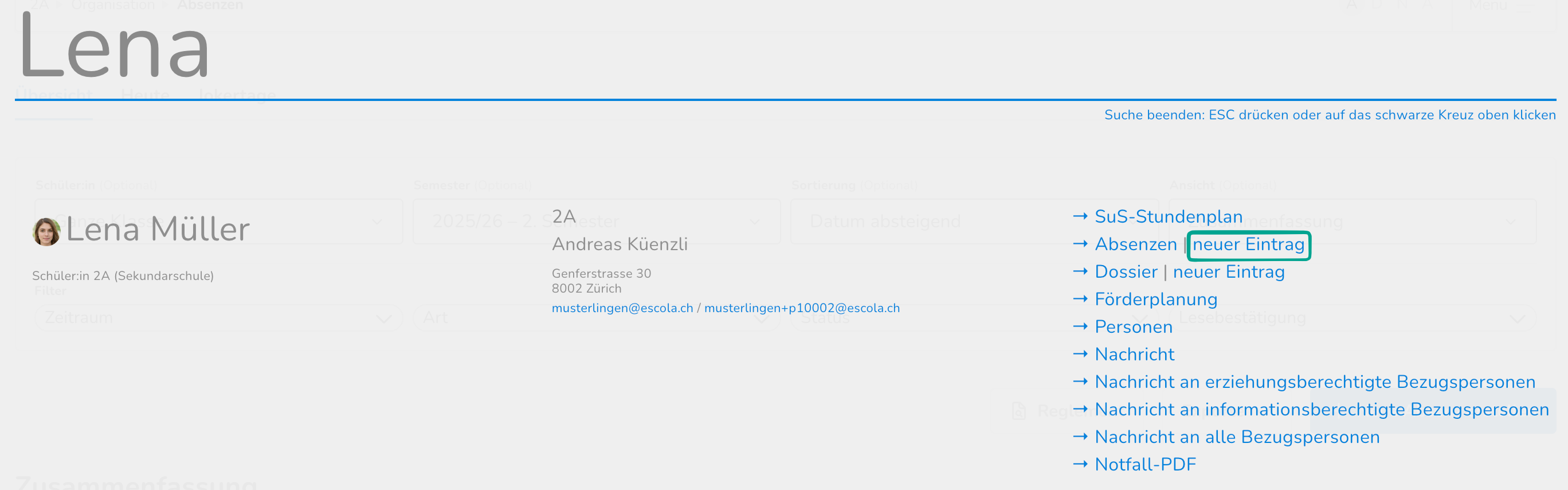 Alternativ kannst du auch über die Suche die entsprechende Schüler:in aufrufen und dort direkt neben Absenzen auf "neuer Eintrag" klicken.