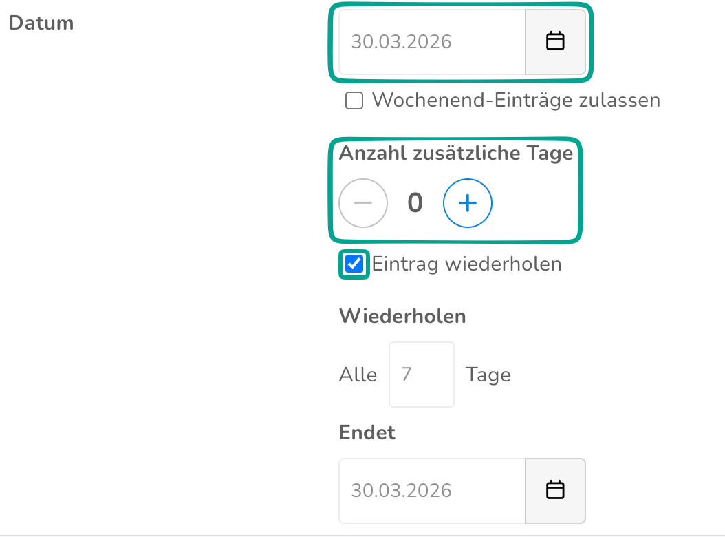 Gib unter Datum das richtige Datum und (falls die Absenz mehr als einen Tag beträgt) die Anzahl an zusätzlichen Tagen an. Hier können auch Absenzen, die sich periodisch wiederholen, eingetragen werden.