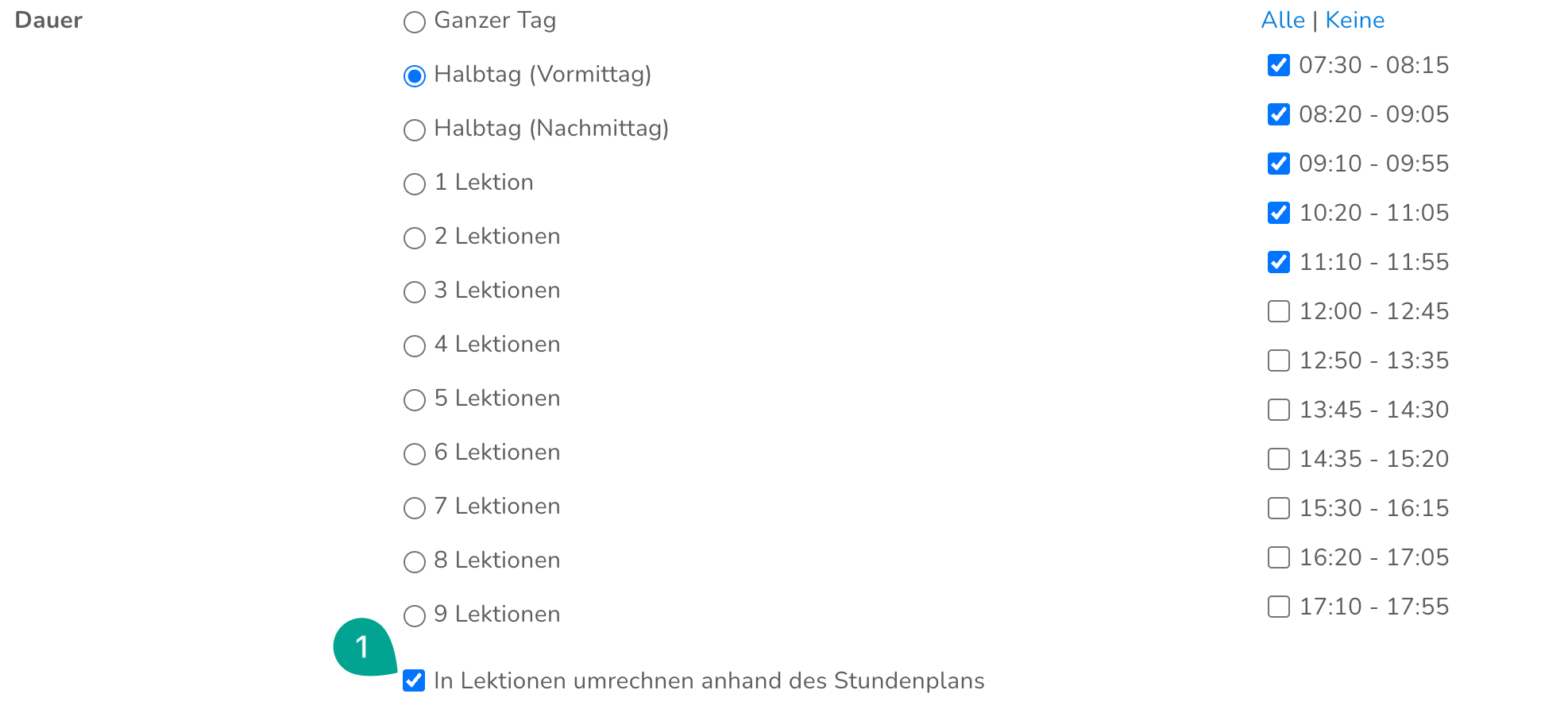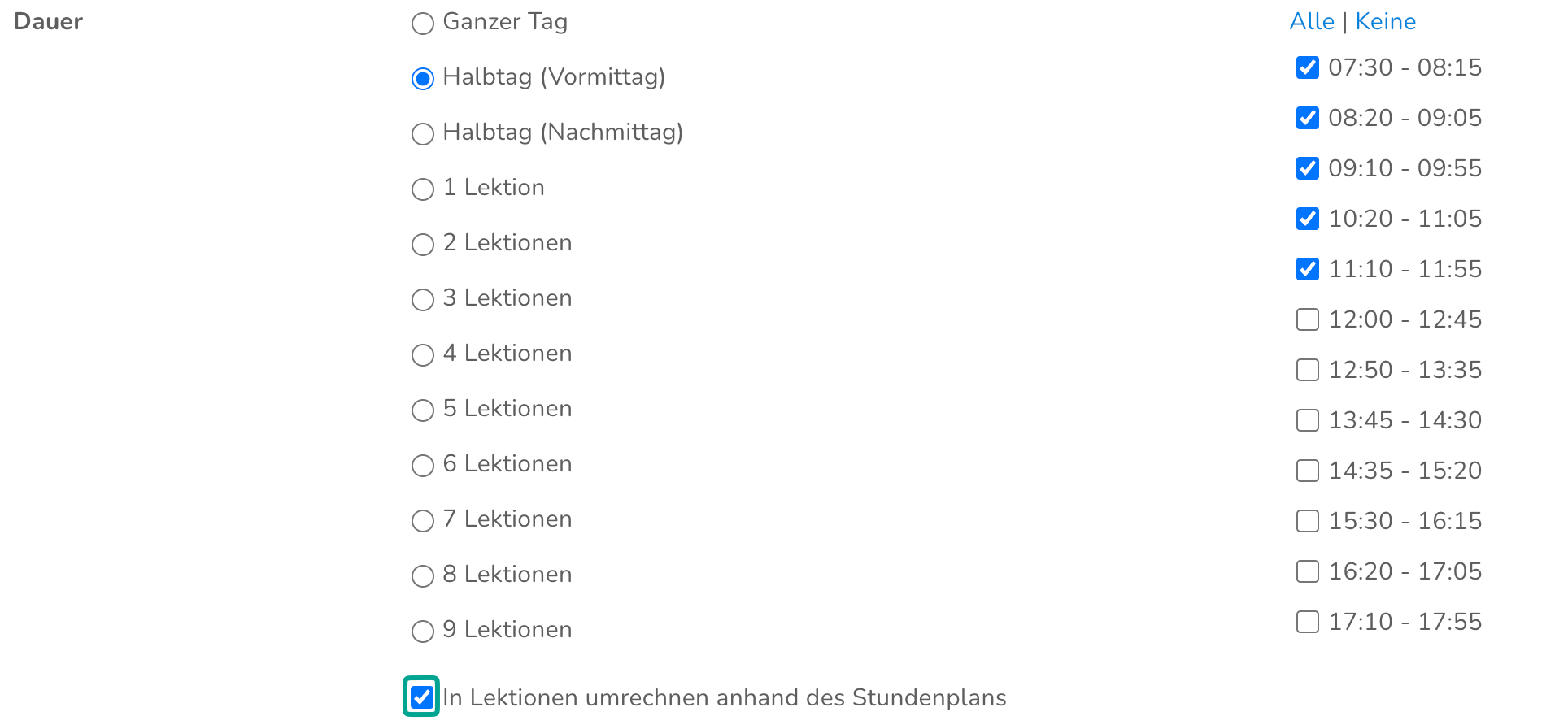 - Spezifische Lektionen, welche pro Schuleinheit unter Lektionszeiten definiert wurden
