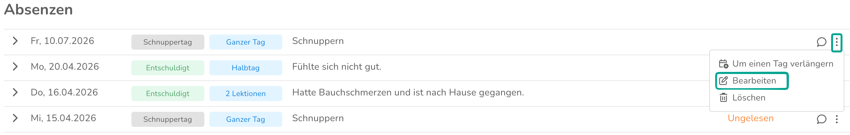 Eine Absenz kann nachträglich noch bearbeitet werden. Klicke dafür auf die drei Punkte und dann auf "Bearbeiten".