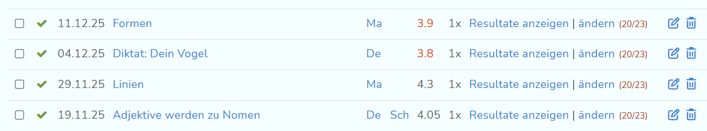 Hier siehst du alle LZK, der Klasse, für die du Zugriffsrechte hast. Das Häkchen auf der linken Seite zeigt dir an, ob Eltern auf diese LKZ zugreifen können. Weiter werden dir von links nach rechts das Datum, der Titel, das Fach, der Notendurchschnitt der Klasse und der Faktor der Gewichtung der Note der einzelnen LZK angezeigt. Am Ende der Zeile siehst du, wie viele der SuS der Klasse an der LZK teilgenommen und eine Note erhalten haben.