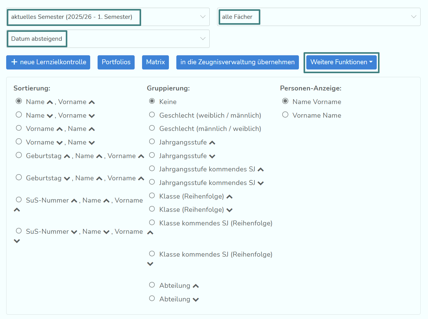 Im oberen Bereich der Seite stehen dir verschiedene Filtermöglichkeiten zur Verfügung. Es kann nach Semestern und Fächern gefiltert und nach Datum sortiert werden. Klickst du auf "Weitere Funktionen" kannst du neben weiteren Sortierungen auch Gruppierungen nach verschiedenen Kriterien vornehmen.