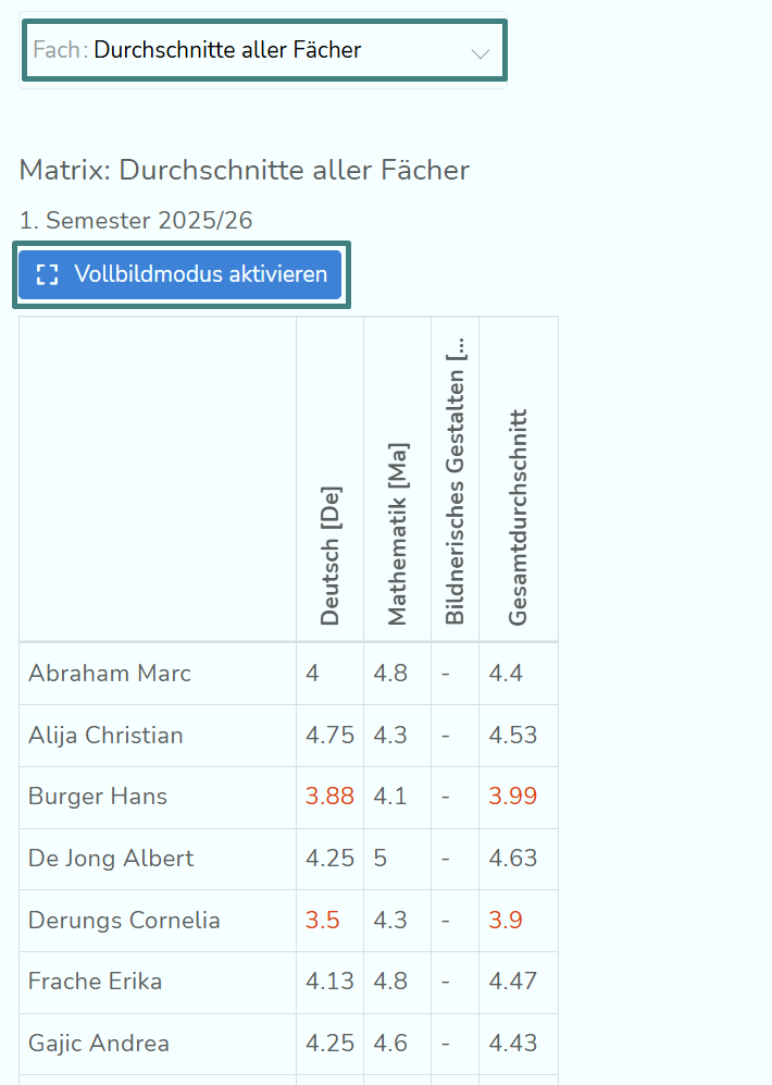 Um eine Überblick über die Noten der SuS im Vergleich zu bekommen, klicke in der Übersicht auf "Matrix". Hier kannst du dir die Durchschnittsnoten aller SuS pro Fach sowie den Gesamtnotendurchschnitt pro Schüler:in anzeigen lassen. Unten in der Tabelle findest du auch die Klassendurchschnitte pro Fach und den Gesamtklassendurchschnitt. Über ein Drop-Down kannst du dir auch die Ergebnisse der einzelnen LZK eines Fachs anzeigen lassen.