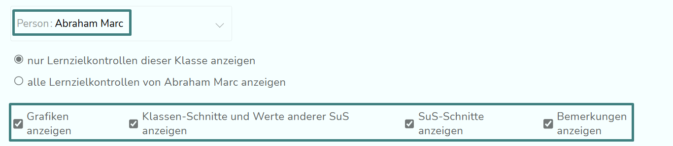 Wichtig: Klicke auf "alle Lernzielkontrollen von Vorname Nachname anzeigen", damit auch die LZK der Arbeitsgruppen angezeigt werden, denen Schüler:innen zugeordnet sind.