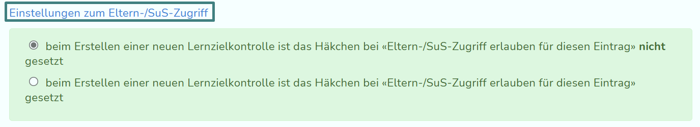 Klicke zunächst auf "Einstellungen zum Eltern-/SuS-Zugriff", um festzulegen, ob diese LZK bereits beim Erstellen für Eltern und SuS sichtbar sein soll.