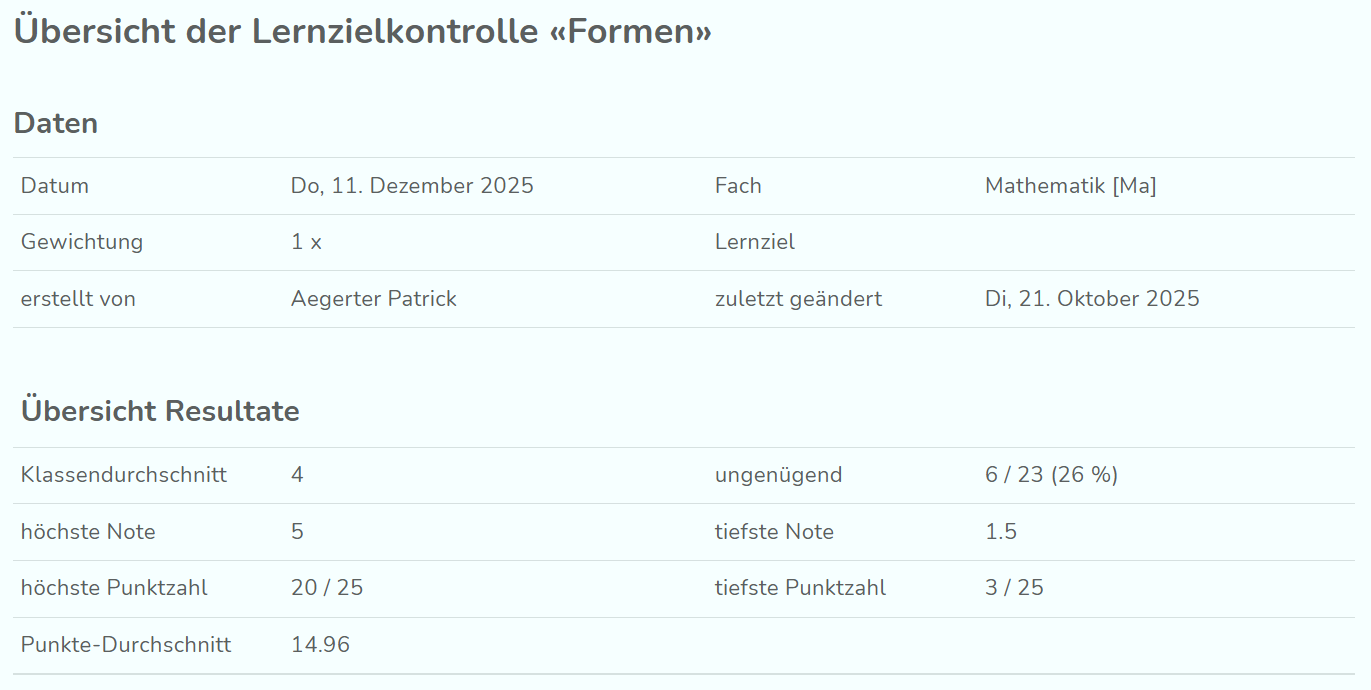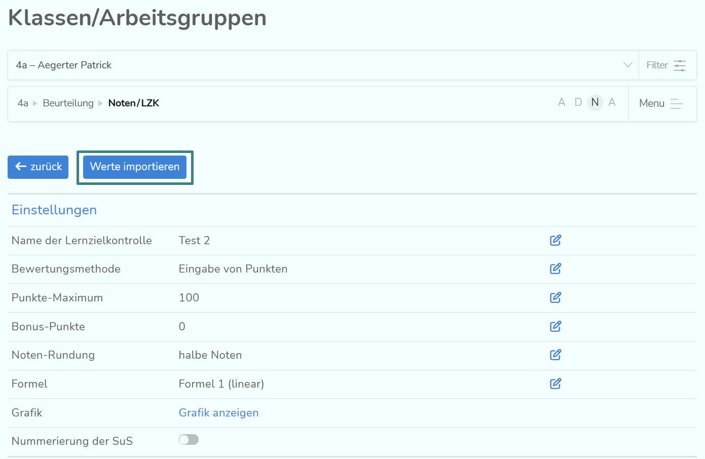 Weiter unten auf der Seiter zu den Resultaten der LZK kannst du das Ergebnis pro Schüler:in eintragen oder bearbeiten. Je nachdem, welche Art der Bewertung du beim Erstellen der LZK gewählt hast, sieht die Eingabe ein wenig anders aus.