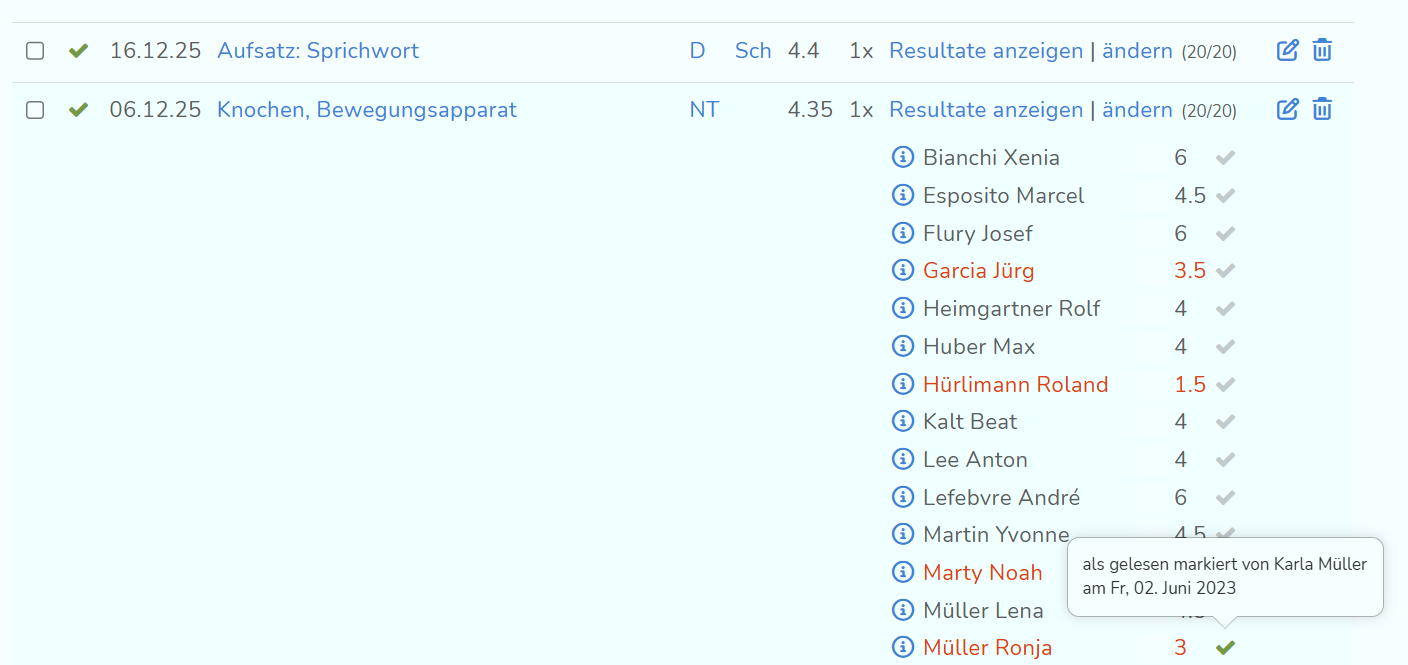 Wenn du auf "Resultate anzeigen" klickst, werden dir die Ergebnisse der einzelnen SuS angezeigt. Hier wird dir mit einem grünen Häkchen neben der Note angezeigt, ob das Resultat der LZK von den Eltern gelesen wurden. Fährst du mit der Maus darüber, wird dir auch angezeigt, welcher Elternteil es gesehen hat und an welchem Tag.