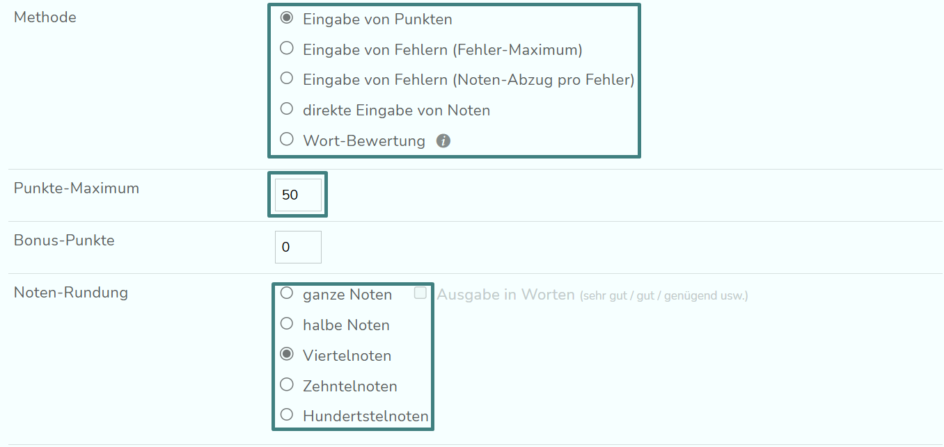 Wenn du "Eingabe von Punkten" oder "Eingabe von Fehlern (Fehler-Maximum)" wählst, musst du jeweils das Punkte- bzw. Fehler-Maximum definieren. Ausserdem kannst du entscheiden, auf welche Form die Noten gerundet werden sollen. Bei ganzen Noten können die Noten auch als Worte ausgegeben werden.