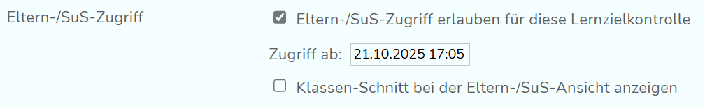 Wenn diese Option bei deiner Schule besteht, kannst du nun festlegen, ob Eltern und SuS Zugriff auf diese LZK bekommen sollen und ab welchem Zeitpunkt.