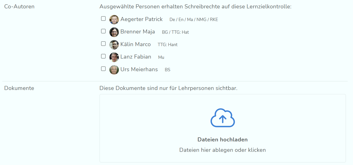 Falls weitere Personen Schreibrecht auf diese LZK bekommen sollen, kannst du Co-Autoren aus den Lehrpersonen auswählen, die ebenfalls dieser Klasse bzw. Arbeitsgruppe zugeordnet sind. Zuletzt kannst du Dokumente hochladen. Diese sind nur für Lehrpersonen sichtbar. Speichere zum Abschluss die LZK.