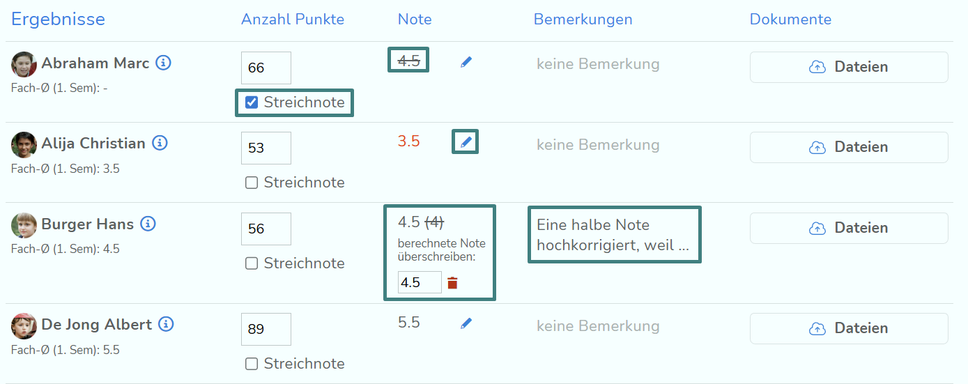 Wenn du die Bewertung beispielsweise über Punkte gewählt hast, kannst du einfach die erreichte Punktezahl pro Schüler:in eingeben und die Note wird automatisch berechnet. Klickst du auf den kleinen Stift neben der Note, hast du die Möglichkeit, eine Note manuell zu überschreiben. Wenn eine Note aus der Gesamtwertung ausgeschlossen werden soll, setze das Häkchen "Streichnote".