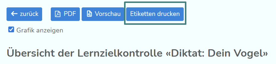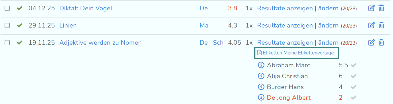 Die Vorlagen stehen auch in der Übersicht der Lernzielkontrollen zur Verfügung. Wenn du bei einer der LZK auf "Resultate anzeigen" klickst, kannst du von dort aus direkt das PDF für den Etikettendruck erstellen.