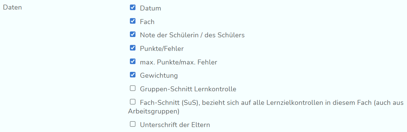 Entscheide, welche Daten der LZK auf die Etiketten gedruckt werden sollen und ob eine Unterschrift der Eltern erwünscht ist.