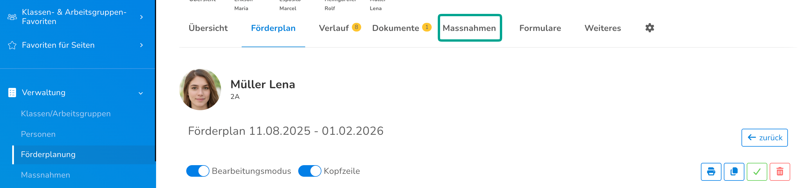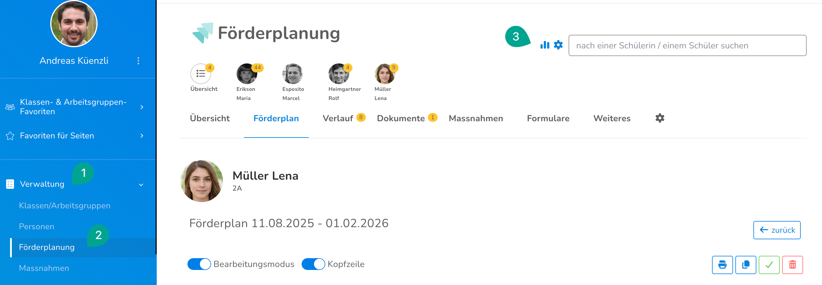Über Verwaltung (1) > Förderplanung (2) kann man über das Massnahmen-Icon (3) zu einer Übersicht über alle Massnahmen kommen.